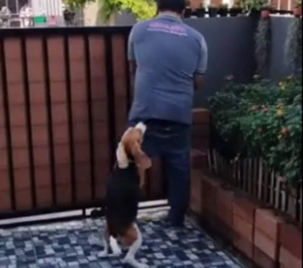In this funny yet heart-tugging footage, a man attempts to unlock their gate. Not far away from him, one can see an adorable Beagle pouncing on him.