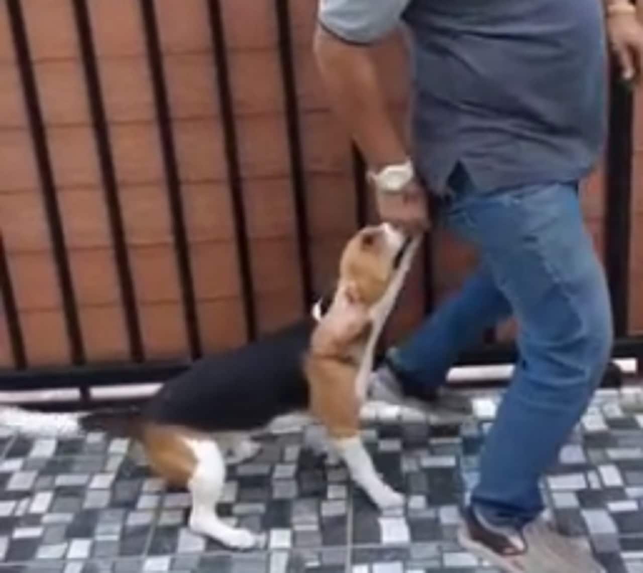 Seeing Dad’s warning glance, the pup lets go of his trousers. However, when Dad still attempts unlocking the gate despite the interruption, the desperate Beagle resumes pouncing on Dad’s leg and clings to it.